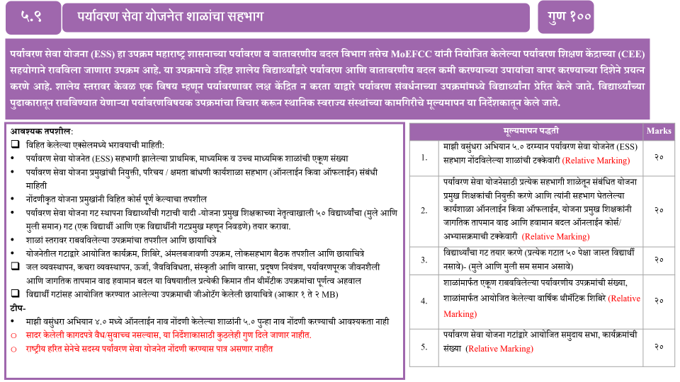 पर्यावरण व वातावरणीय बदल विभाग महाराष्ट्र शासन, पर्यावरण सेवा योजना (ESS) संपूर्ण राज्यभरात राबविण्यात येत आहे. यांमध्ये महानगरपालिका, नगरपरिषद, नगरपंचायत तसेच ग्रामपंचायत हद्दीतील प्राथमिक, माध्यमिक व उच्च माध्यमिक शासन मान्य शाळा स्वेच्छेने ऑनलाईन माध्यमातून सहभाग नोंदवू शकता.